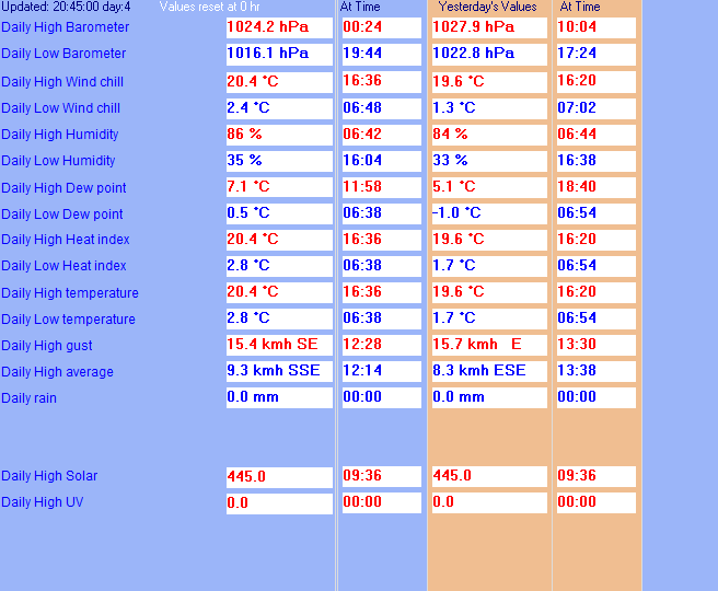 | Maximum Temperature (since midnight) | 20.4°C at: 16:36 | Minimum Temperature (since midnight) | 2.8°C at: 06:38 |